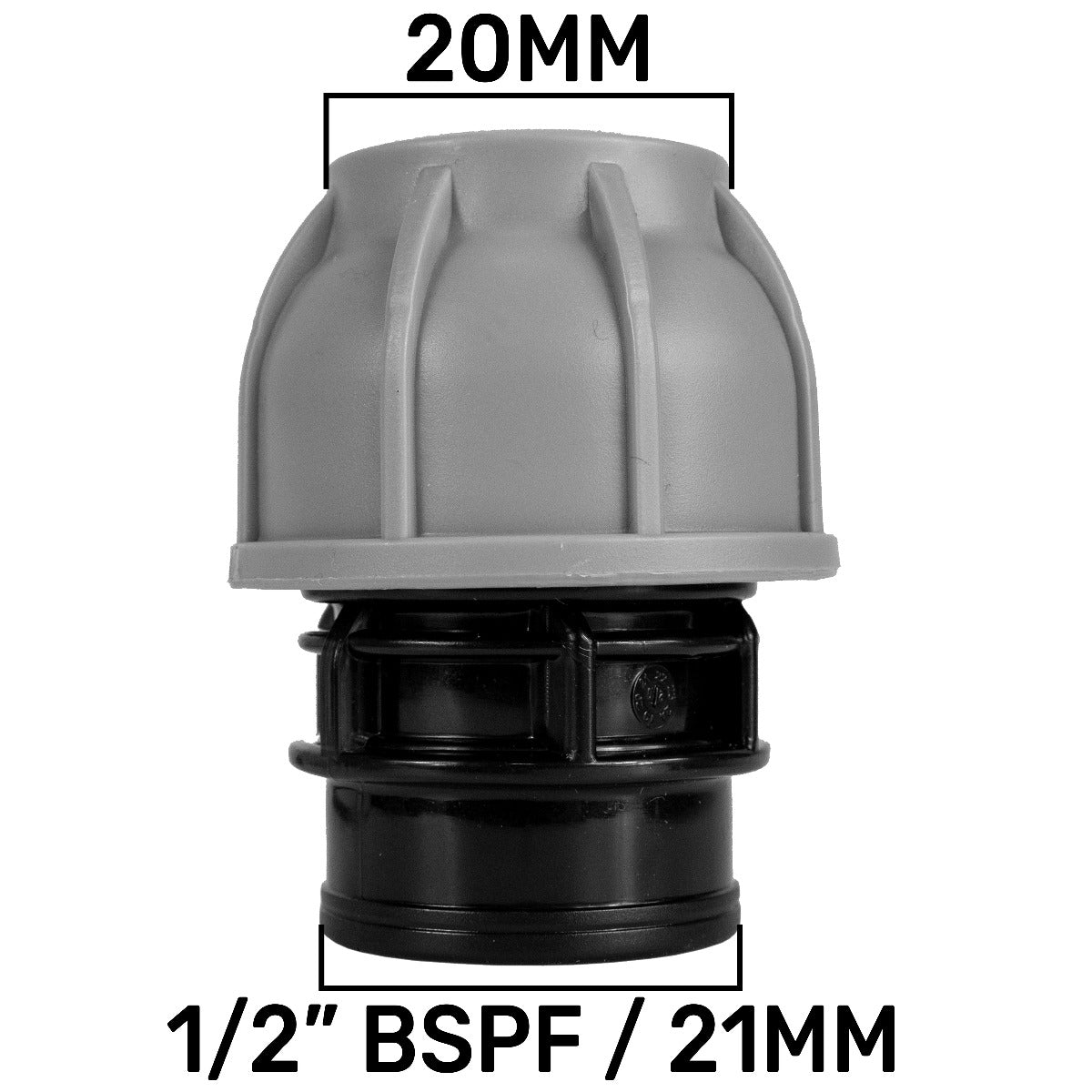 This is an MDPE Straight Joiner Compression Fitting to adapt from a 20mm pipe to a 1/2" BSP Female thread. A straight connector is a type of pipe fitting used to join two pieces of piping or tubing in a straight line, without any angle or deviation. It's a simple yet essential component in plumbing, fluid transport, and various other applications where a direct, uninterrupted connection between two pipes is needed.