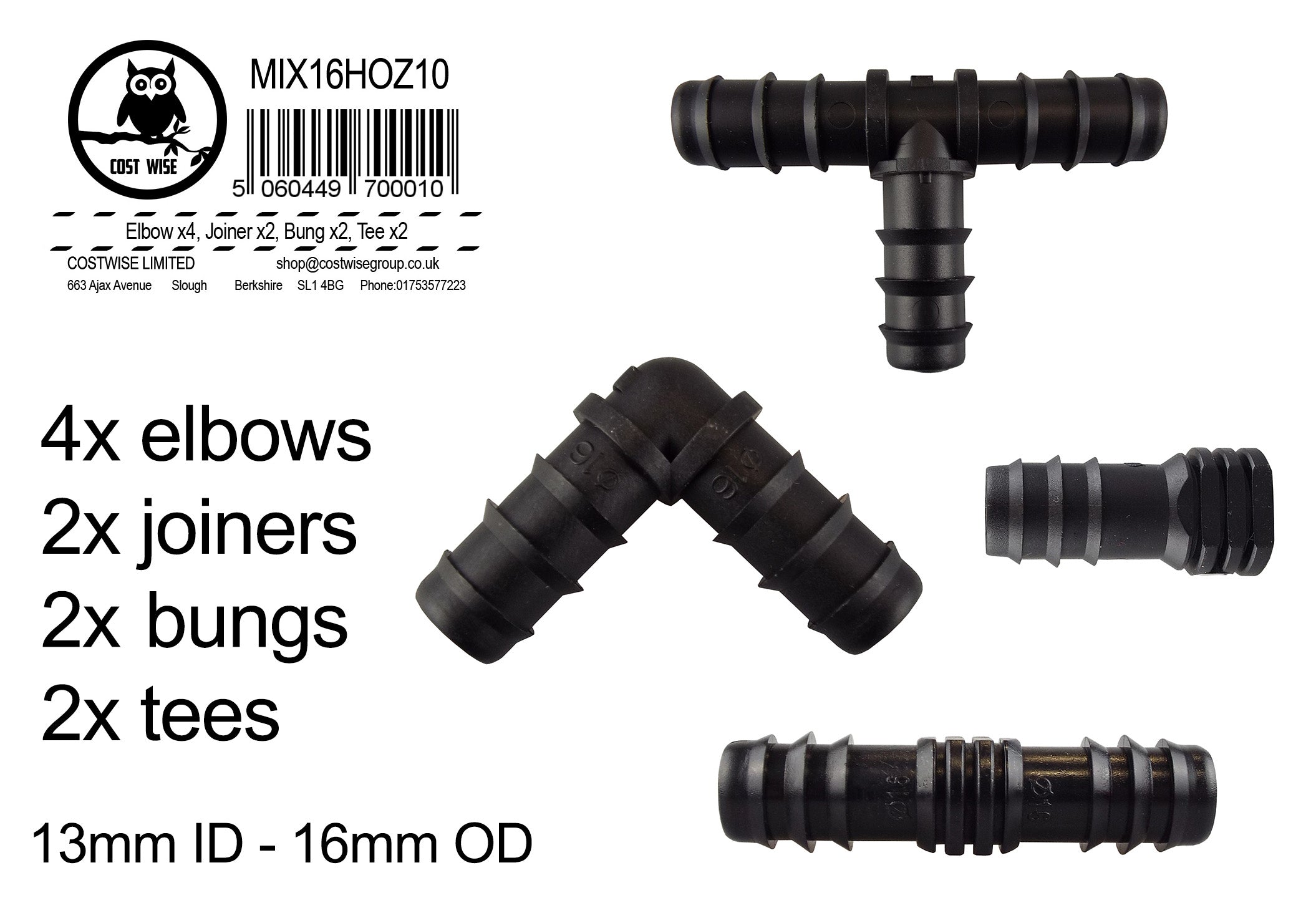 This ½” barb connectors mixed kit contains: 4 x elbows, 2 x joiners, 2 x bungs, 2 x tees.