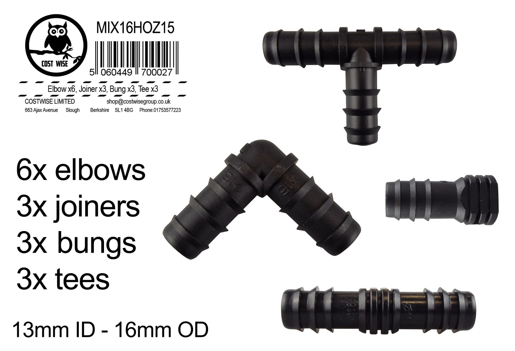 This ½” barb connectors mixed kit contains: 6 x elbows, 3 x joiners, 3 x bungs, 3 x tees.