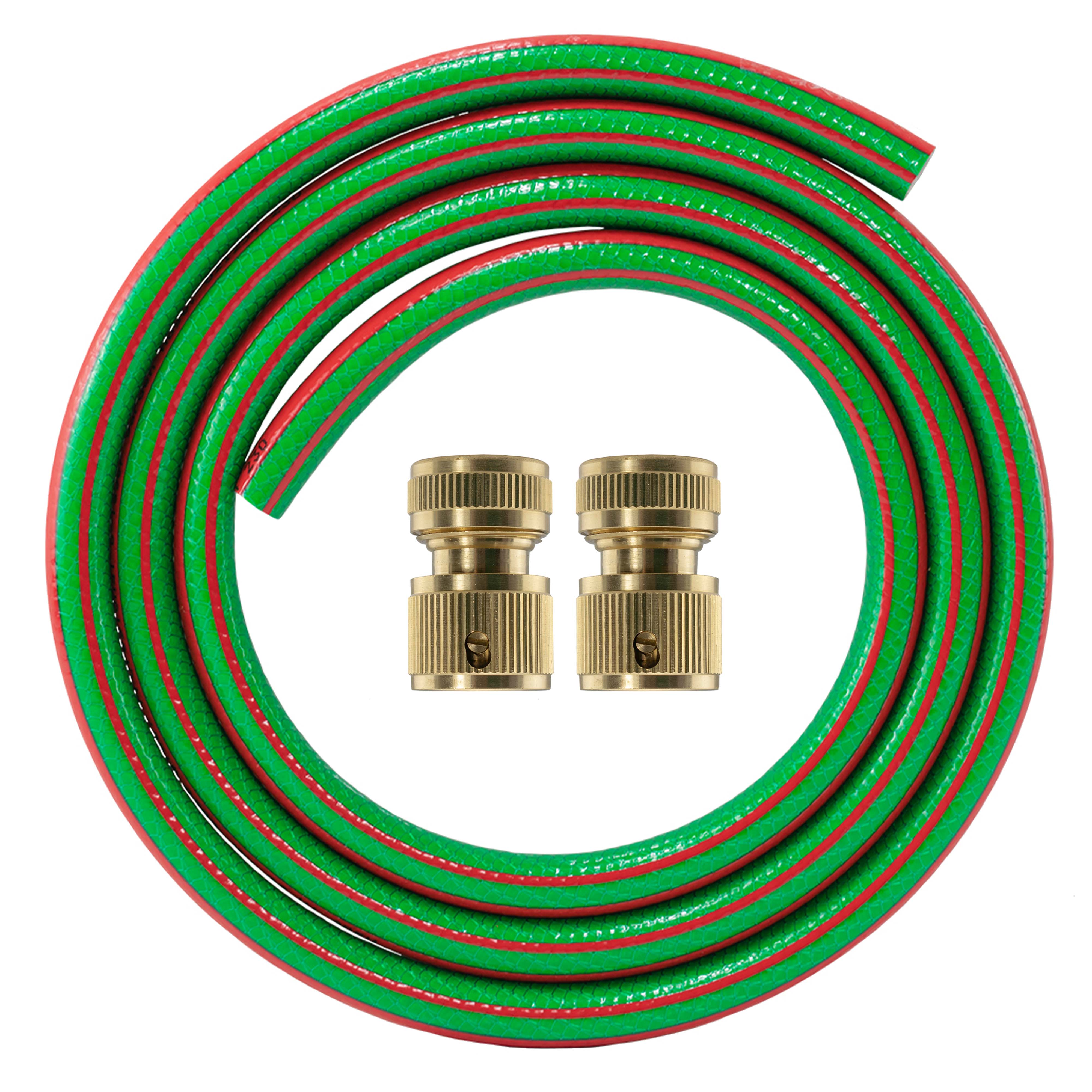 The Green 6-layer Flexible Garden Hose is the ultimate solution for all your watering needs. Built with advanced technology and high-quality materials, this hose features a six-layer construction engineered for superior durability and performance. Each layer serves a specific function, from an anti-algae core and flexible PVC to polyester braiding that prevents twisting and bending, all encased in a weather-resistant green outer layer with a red stripe.