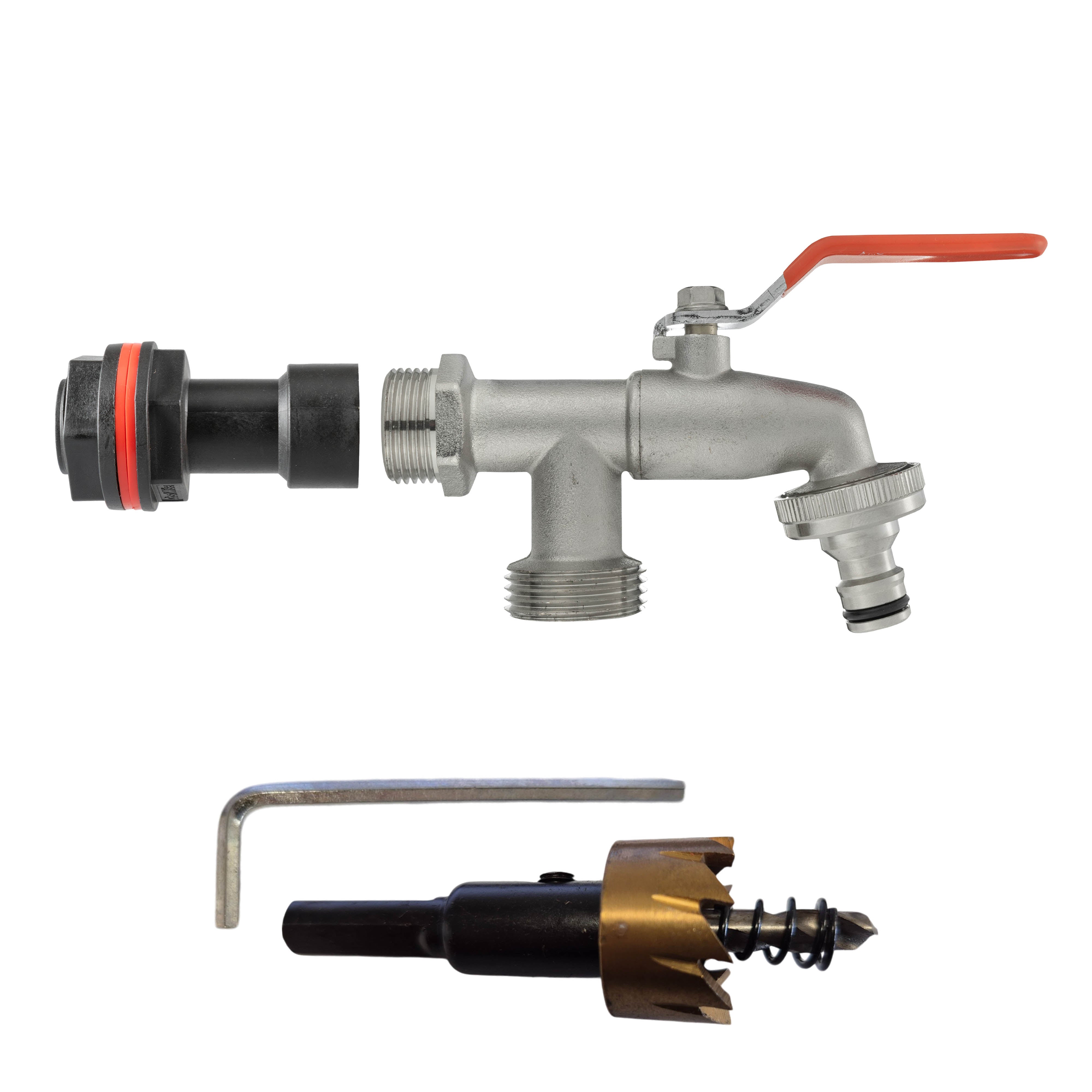 The device has a 3/4" BSP thread size which fits a 26mm hole. For installation, the connector can be effortlessly screwed into existing female threads on your container. This is an ideal solution if your water butt already has pre-installed threads. However, if your barrel lacks a pre-existing thread, the connector can still be installed by creating a hole in the desired location.