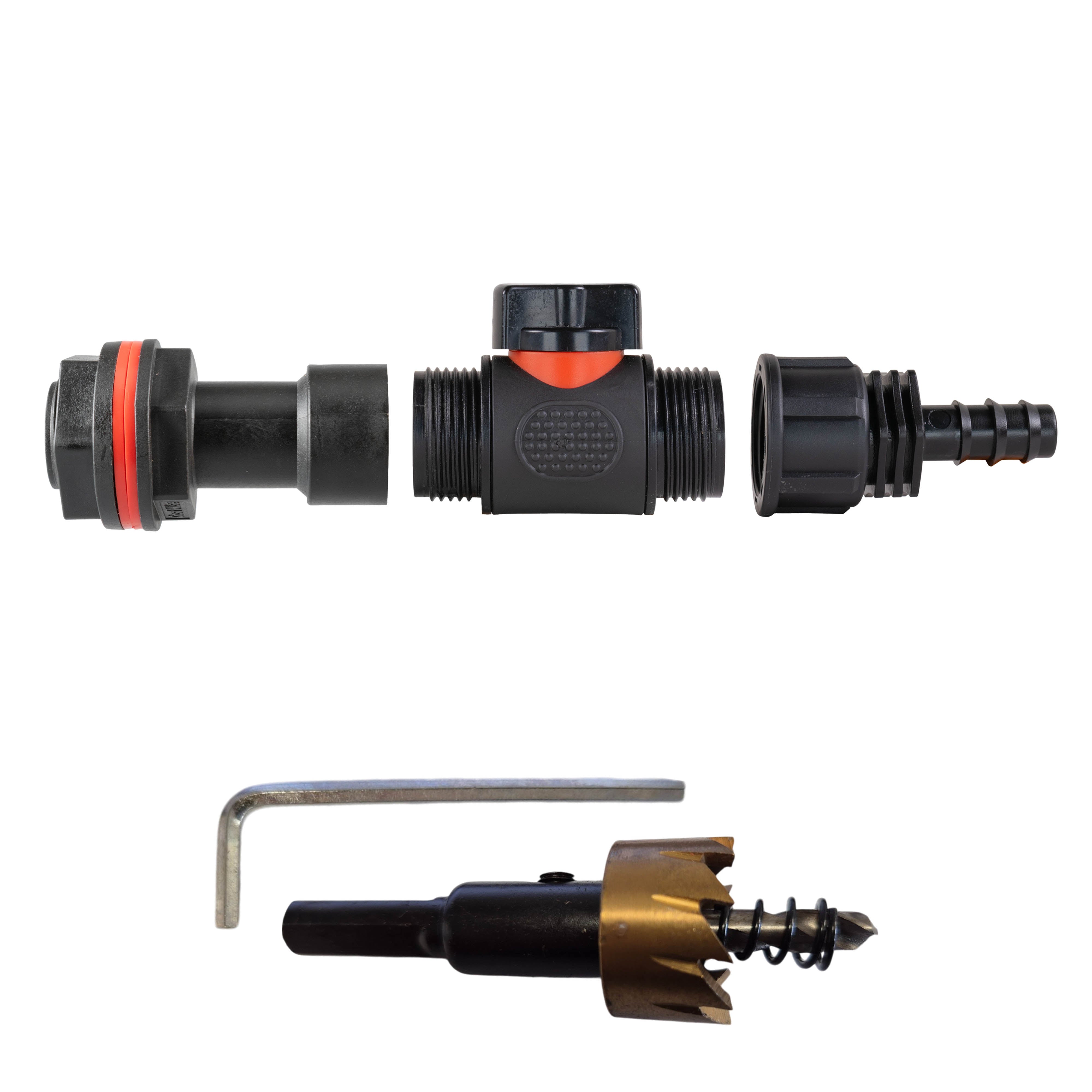 The device has a 3/4" BSP thread size which fits a 26mm hole. For installation, the connector can be effortlessly screwed into existing female threads on your container. This is an ideal solution if your water butt already has pre-installed threads. However, if your barrel lacks a pre-existing thread, the connector can still be installed by creating a hole in the desired location.